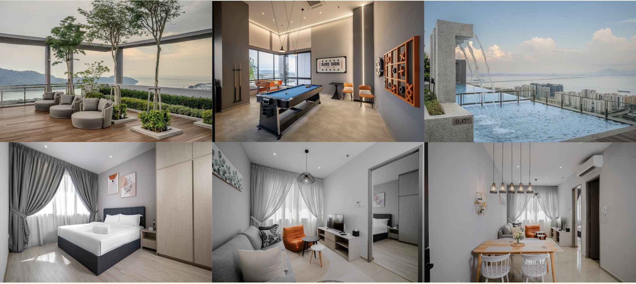 空港から車で15分。完成からまだ数年で新しく、眺め最高の屋上プールやキッズプレイエリアなど、設備も充実のコンドミニアムです。AEONがある巨大なモールまで車で5分、徒歩圏内にはローカルの屋台やコンビニもあり、世界遺産のジョージタウンまでも車で15分という便利な立地です。