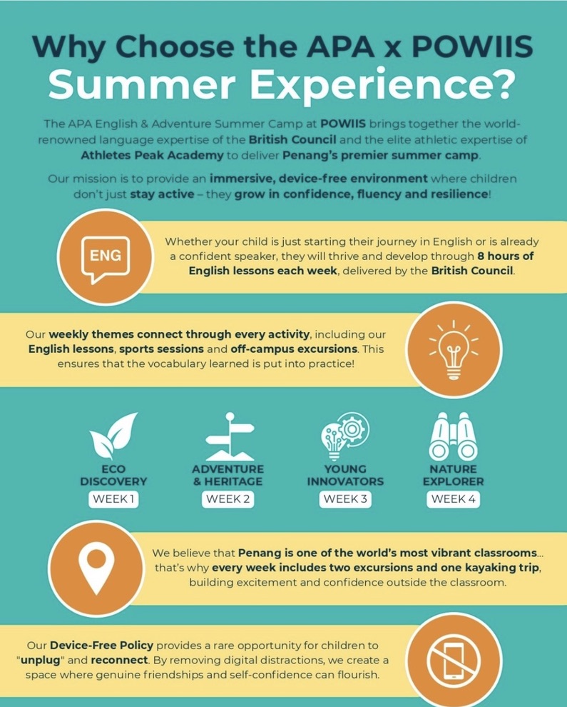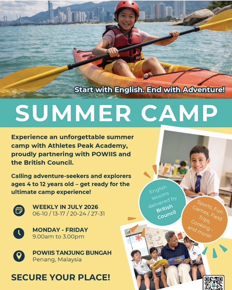 幼稚園〜Year8の生徒が学ぶPOWIISタンジュンブンガキャンパスの校舎を使用したサマーキャンプ。英国の公的機関「Britich Council」による質の高い英語レッスンが提供されるほか、APA English & Adventure運営によるアート、クッキングなどのクリエイティブなアクティビティ、ペナンの自然を体感できるアウトドア探索、遠足などダイナミックな体験が可能です。